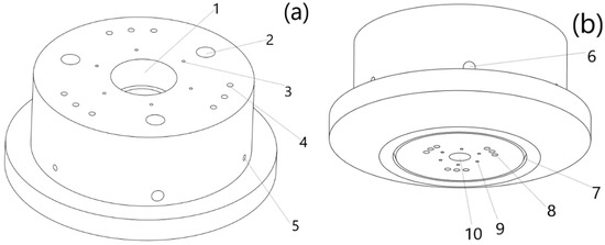 The structure diagram of the new cladding nozzle. (a) Vertical view; (b) bottom view. 1. Central laser beam inlet; 2. water cooling channels outlet; 3. inner 6-way powder feeding channels inlet; 4. outer 9-way powder feeding channels inlet; 5. protective gas channels inlet; 6. water cooling channels inlet; 7. protective gas channels outlet; 8. outer 9-way powder feeding channels outlet; 9. inner 6-way powder feeding channels outlet; 10. central laser beam outlet.