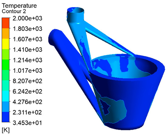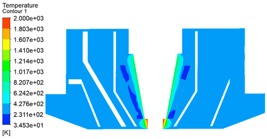 The temperature distribution of cooling water channels is shown in Figure 4. The temperature at the entrance is low and increases gradually in the downward water flow process. The temperature increases gradually in the annular cone cooling channels. The highest temperature is about 450 K. The temperature distribution shows that the temperature rise near the inlet and outlet are faster than far from the inlet and outlet. According to the analysis, the reason for this is that water with a lower temperature first enters the back of the ring cone, then rises, and then enters the outlet. Because the temperature at the upper end of the cone is low, the temperature rise of this part of the flow is slow. After mixing with other parts of the water, the temperature generally increases to a higher temperature.
