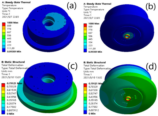 The influence of the thermal stress on the deformation of the nozzle is shown in Figure 5c,d. It can be determined that the maximum deformation position of the nozzle without cooling water is mainly distributed at the bottom of the nozzle. The maximum value was about 1 mm. The deformation distribution was slow, and the deformation value near the top of the nozzle was also large, and was about 0.5 mm. The results show that the deformation of the nozzle with cooling water was obviously reduced. The maximum value was about 0.35 mm, the deformation rate was very fast, and the deformation at the entrance of the cooling channels was reduced to about 0.15 mm. It could be said that cooling water has a good inhibition on the thermal deformation of the nozzle.