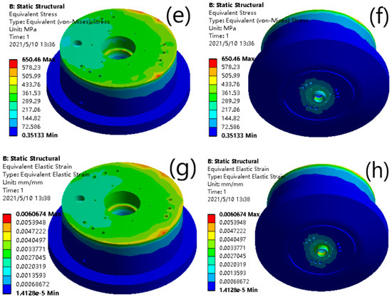 Simulations on the effect of water cooling. (a) Vertical view of steady-state thermal; (b) bottom view of steady-state thermal; (c) vertical view of total deformation; (d) bottom view of total deformation; (e) vertical view of equivalent stress; (f) bottom view of equivalent stress; (g) vertical view of equivalent elastic strain; and (h) bottom view of equivalent elastic stress.