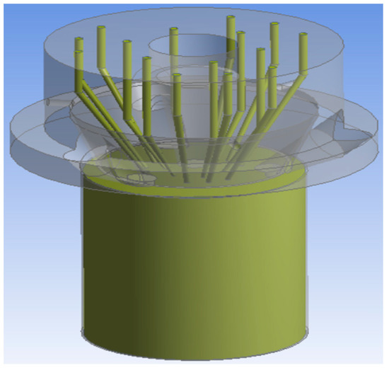 It is shown in Figure 6 that after importing the supplementary 3D model, the powder feeding channels and boundary need to be filled to generate the simulation entity. In the simulation process, the simulation process and results of the powder flow in the powder feeding channels and the spray range are mainly observed, so the remaining entities could be compressed. The simulation process of the inner and outer loops is more consistent with the real machining state. In this paper, the range of powder spraying is estimated and the simulation boundary beyond the powder spraying outlet is drawn. The center laser beam outlet and the three outer laser beam outlets are then filled to prevent them from participating in the simulation process. The modeling results are shown in Figure 6. At the end of the early modeling, the model is meshed.