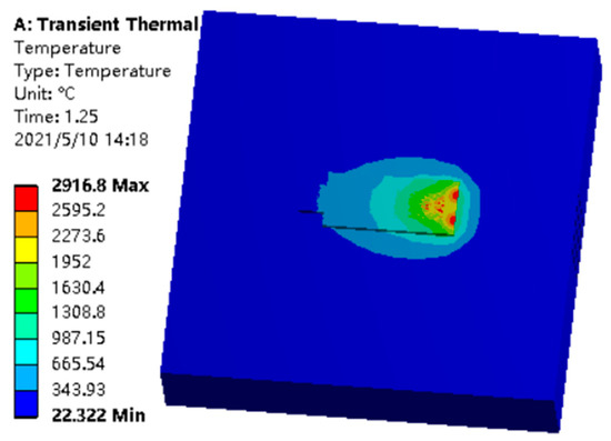 The results of simulation are shown in Figure 9. From the simulation results, the maximum temperature could reach 2900 °C when multiple laser beams worked at the same time. It was much higher than a single laser spot. At the same time, it could be clearly observed that the coverage of the high temperature was greatly improved. It was not only because of the linear increase in the number of light spots, but also because of the nonlinear enhancement when multiple light spots worked together. We took titanium alloy as an example; the cladding point of titanium alloy is about 1700 °C, and a range of temperatures higher than 1700 °C could cover almost all of the upper surface of the small squares in the heat source processing because the cladding point of titanium alloy is much higher than aluminum alloy, copper alloy, magnesium alloy, and other alloys. Therefore, this temperature effect could be applied to most alloys and the speed of the temperature drop is more gradual, which is more conducive to the processing of high-quality workpieces. Because it is a numerical simulation process, it could not be the same as a continuous and stable high temperature in an actual machining process; therefore, we only need to look at the simulation results in the high temperature band. Analysis showed that the heat source state was stable, and the moving speed was the specified speed, which was the planned laser beam moving speed. Many desired simulation results could be determined in the thermal analysis process, and subsequent simulations or experiments could be better optimized and improved through these results. In this paper, we couple the forming part of the “thermal solid” basing on the thermal analysis. Therefore, the mechanical properties of the workpieces in the process of hot forming could be analyzed. The mechanical analysis was related to the previous thermal analysis; therefore, five elements were still used to simulate the cladding and solidification to analyze the simulation results of the structural deformation.