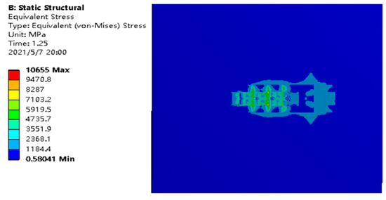 The equivalent stress of the thermal influence on the nozzle is shown in Figure 5e,f. It can be seen that the equivalent stress decreases obviously in the part with the cooling water. When there is no water-cooling part, the maximum equivalent stress was about 1600 MPa, and the equivalent stress value of the main equivalent stress distribution was about 500 MPa. When there was water cooling, the maximum equivalent stress value was about 650 MPa. And it is about half of the previous. The equivalent stress of the main distribution was about 150 MPa, and the average of the rest is decreased significantly. It can be seen that water cooling has a significant decrease in the equivalent stress of the nozzle.