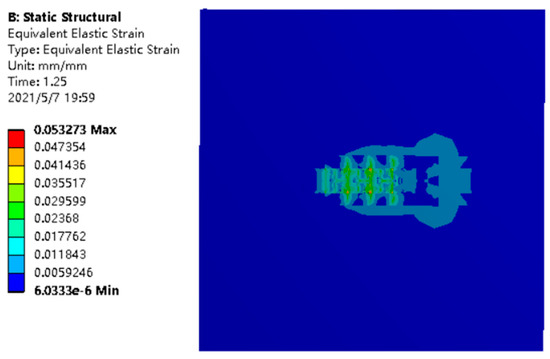 It is shown in Figure 11 that the maximum values of equivalent strain decreased gradually from the center to the periphery. Of course, due to the increase in the number of laser spots, the influence range of the strain was obviously improved compared to that of single laser; however, due to its coupling relationship, the influence range of strain could produce a nonlinear and more stable decline. At the same time, it could be observed that the influence range of the strain is not only the range of the small squares, which is the part of the structure, but also has a certain impact on the substrate. In actual processing, the powder would penetrate into the substrate under the effect of high temperature heat energy, which has a certain impact on the substrate.