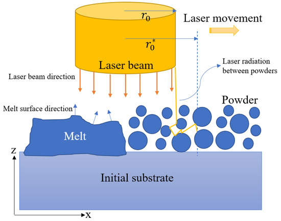 where is the angle between the laser direction and the normal melt surface. In addition, the scattering effect in the laser–powder interaction is modeled using the Beer–Lambert law as [23]