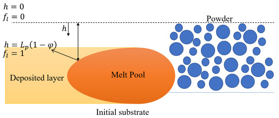 where h is the distance from the melt surface to the initial powder layer, as shown in Figure 2. Assuming a linear relationship between h and the liquid fraction, , h can be expressed as:
