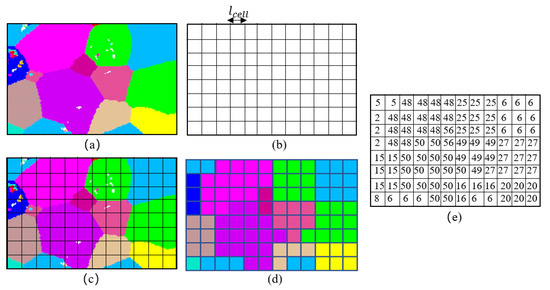 Mapping initial grain structure of IN718 substrate to CA computational domain. (a) Experimental EBSD results. (b) CA domain. (c) EBSD results overlaid with CA cell. (d) Mapping of EBSD crystallographic orientation results to CA domain. (e) Mapped EBSD results in CA computational domain.