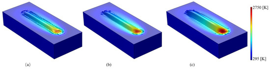 Figure 5 shows the simulation results obtained from the 3D-FE model for the track shape produced in the single-track SLM processes performed using a laser power of 150 W and scanning speeds of 500, 400, and 300 mm/s, respectively. As shown, the melt pool has a convex shape with a size that increases with an increasing heat input (defined as the ratio of the laser power, Q, to the scanning speed, v [36].) A detailed inspection shows that the melt pool width and depth have values of 123 µm × 89 µm, 143 µm × 106 µm and 183 µm × 133 µm for heat inputs of Q/v = 300 J/m, 375 J/m, and 500 J/m, respectively.