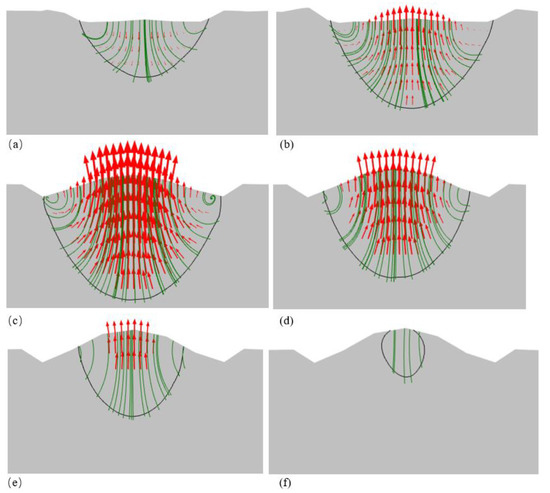 Different melting stages in SLM process. (a) Powder volume shrinkage and melt formation. (b) Spheroidization of melt pool due to Marangoni and surface tension forces. (c) Start of solidification. (d–f) Solidification of melt pool from edge toward center. Black line shows melt pool boundary, green lines show melt velocity streamlines, and red arrows show melt velocity vectors.