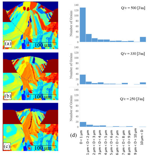 Figure 9d presents the grain size statistics for heat inputs of 250, 330, and 500 J/m, respectively. From inspection, the grain number increases from 83 to 123 to 239 as the heat input increases from 250 to 330 to 500 J/m, respectively. In other words, the number of grains in the melt pool scales proportionally with the intensity of the heat input. This result is reasonable, since as the heat input increases, a larger interface is formed between the melt pool and the substrate (see Figure 9a–c), and consequently, the number of partially melted grains, which can prompt epitaxial growth, also increases. More importantly, as the heat input increases, the solidification speed decreases, and then the epitaxial grain growth reduces (as shown by Equation (35)). In this condition, more equiaxed grains can be formed at the edge of the melt pool before the equiaxed grains capture the upstream melt region. These equiaxed grains start to grow toward the local temperature gradient vectors and eventually form a columnar shape.