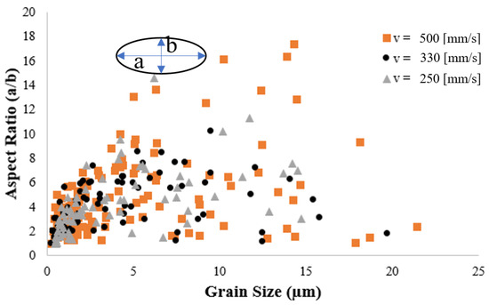 By statistical calculation of grain structures shown in Figure 9a–c, it is seen that the maximum grain size increases from 14.7 µm to 19.6 µm to 21.4 µm as the heat input increases from 250 to 330 to 500 J/m, respectively. By contrast, the average grain size decreases from 3.61 µm to 3.11 µm to 2.89 µm. The reduction in the average grain size with an increasing heat input can be attributed to the higher rate of equiaxed grains formation at the melt-powder interface, as described above. To investigate this phenomenon further, the grains in the melt pool region were fitted with ellipsoids with long and short axes of a and b, respectively. The aspect ratio (a/b) of each grain was then plotted against the corresponding grain size, as shown in Figure 10. It is seen that for each of the considered heat inputs, the melt pool contains many fine grains with an aspect ratio greater than 1. In fact, these grains are equiaxed grains nucleated close to the melt–powder interface. As discussed above, these grains grow toward the temperature gradient as the solidification process proceeds and thus tend to elongate and form a columnar shape. Overall, the results show that even though a higher heat input increases the maximum grain size, it also prompts the formation of a large number of small grains at the melt pool–powder boundary, and these small grains reduce the average grain size in the melt pool.