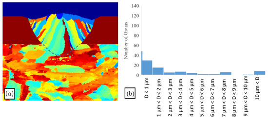 Results for single-track SLM trial performed with laser power of 100 W, scanning speed of 400 mm/s, and initial substrate grain size of 15 µm (a) Simulation results (b) grain size histogram.