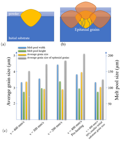 As shown in Figure 14a,b, in multilayer SLM processing, the original track is partially remelted by the adjunct and upper tracks. As a result, only the grains in the lower region of the melt pool participate in epitaxial grain growth. In fact, most of the grains close to the melt surface, or at the melt–powder boundary, play little or no role in the formation of the final microstructure. To clarify the effect of multitrack SLM processing on just epitaxial grains, Figure 14 compares the melt pool and grain size statistics, including all grains or just epitaxial grains of the original track produced under various SLM processing conditions. It is seen that for all of the considered cases, the average size of the epitaxial grains is larger than that of the average size, including all grains within the melt pool. Moreover, the average epitaxial grain size increases from 4 µm to 4.3 µm to 4.7 µm for heat inputs of 250, 330, and 500 J/m, respectively. However, the epitaxial grain size reduces by around 7% when the initial substrate grain size is reduced by 50%. Substrate preheating increases the average epitaxial grain size to more than 5 µm and also increases the melt pool size.