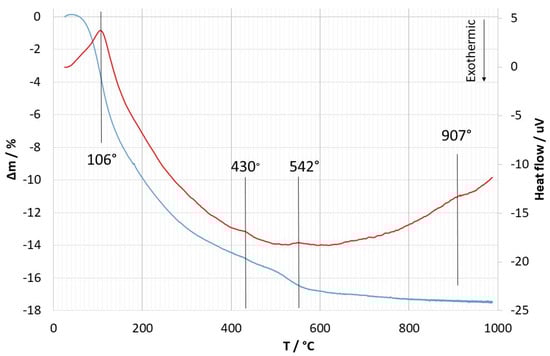 Figure 2 shows the results of TGA and DTA of the coating material. At least four endothermic peaks can be distinguished at 106, 430, 542, and 907 °C in the DTA curve. At the same time, heating to about 900 °C is accompanied by a constant decrease in the mass of the sample with one inflection in the TGA at 542 °C. When heated above 907 °C, the weight loss stops.