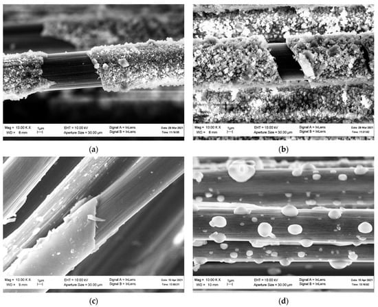 From a practical point of view, the loss of the fiber strength during the coating process needs to be as small as possible. The loss of strength depends largely on the deposition method. Thus, when a titanium carbide layer with a thickness of 200 nm is formed using the molten salt method, the loss of strength reaches 60% [20]. The CVD deposition also results in quite a large loss in the fiber strength. Thus, when pyrolytic carbon was deposited in [21], the loss of strength was about 50%, and when titanium nitride was deposited in [22], it was about 40%. A lower loss of strength can be ensured by lowering the CVD temperature, so in [23], when Al2O3 was deposited, the loss of fiber strength was only 19%. An even lower loss of strength of about 17% was achieved by the authors of [1] using the sol-gel immersion method. This effect of the coating method is most likely due to the chemical interaction between the fiber and the precursors forming the coating as in [20]. This assumption is confirmed by the results mentioned in [21,22,23] showing a decrease in the loss of strength with a decreasing temperature of the deposition process. The results obtained in this work, where the loss of fiber strength was only 13%, fit well into the above logic. This is because one of the advantages of the sol-gel methods is that, usually, they do not require high temperatures and the reagents used do not interact with fiber.