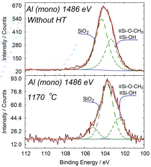 The analysis of the silicon spectra (Figure 4) showed that before heat treatment, silicon is present in three states, in the form of dioxide, and in the form of silanol and ethoxy groups.