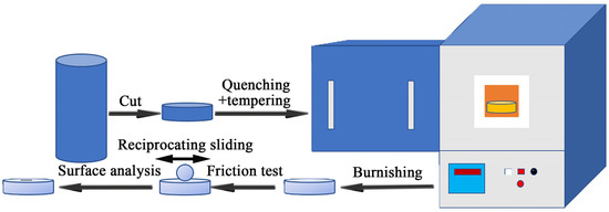 Samples of 7.88 mm in height and 24 mm in diameter were cut from the steel bar with a diameter of 28 mm, and both sides of the samples were mechanically polished. The final roughness of samples is about 300 nm. Before the experiment, the samples were cleaned with alcohol. Dry sliding wear tests were carried out under reciprocating sliding conditions at 50 °C and 125 °C. The contact load was 15 N corresponding to the initial Hertzian contact pressure [32] of 1.10 GPa, the frequency was 10 Hz, the stroke was 3 mm, and the wear time of each sample was 30 min. An optimal SRV-4 high temperature tribotester (Optimol, Munich, Germany) was used for the wear test. The size of the bottom specimen was φ24 mm × 7.88 mm. The final hardness of Nb-free steel, 0.018%Nb steel and 0.040%Nb steel are 61 HRC, 62.5 HRC and 62.5 HRC, respectively. The top specimen is a 100Cr6 steel ball with a diameter of 10.3 mm after induction quenching treatment, and the hardness was 65 HRC. The experimental process is shown in Figure 1.
