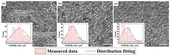 Scanning electron microscope micrographs of the three experimental steels are shown in Figure 2. Microstructures of the samples were cryptocrystalline martensite and spherical undissolved carbides. The diameter distribution of spherical carbides in the 22.5 μm × 30.0 μm field of view was measured by nano-measurer software and the chord length method. The average sizes of carbide particles in Nb-free steel, 0.018%Nb steel and 0.040%Nb steel are about 0.58 μm, 0.45 μm, and 0.39 μm. Nb microalloying reduces the average diameter of undissolved carbides. Fine and uniformly distributed spherical carbides participate in the friction process as wear particles, which are helpful to enhance the wear resistance of bearing steel. In addition, the martensite content of the sample increased with the niobium content, because the niobium could increase the martensite start (Ms) point and promote the martensitic transformation [33].