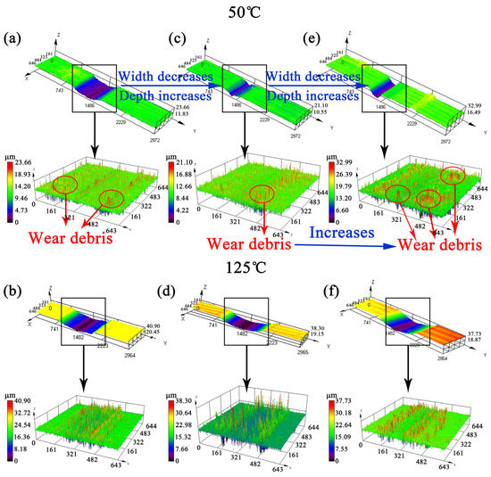 Under the experimental conditions of 50 °C and 125 °C, the worn surface morphology of the specimen is shown in Figure 3. At 50 °C, the worn surface of the Nb-free steel is extremely uneven, and the width of the worn surface is inconsistent. The wide part reaches 1145.0 μm, and the narrow part is only 835.1 μm. The widths of the worn surface in the low Nb steel and high Nb steel are uniform, and compared with the Nb-free steel, the widths of the worn surface are significantly reduced, which are 680.0 μm and 537.5 μm, respectively. There are short furrows on the worn surface of Nb-free steel, while the furrows of low-Nb steel and high-Nb steel are longer and clearer. In the sliding friction process, material transfer and spalling occurred between the two contact surfaces. Under the action of reciprocating alternating contact stress, the continuous reciprocating sliding friction movement caused fatigue spalling of the worn surface. Adhesive wear and fatigue wear produced a certain number of abrasive particles, which led to abrasive wear. Therefore, the wear mechanisms of the three samples were mainly adhesive wear, fatigue wear, and abrasive wear of different degrees. At 125 °C, the average worn surface widths of the three steels are 1205.7 μm, 1192.5 μm, and 1128.2 μm, respectively. In addition to long and continuous furrows, there are many small and short furrows in Nb-free steel, and the furrows in 0.018%Nb steel and 0.040%Nb steel are mainly long and thick. The results show that the wear mechanism changed when the temperature went up from 50 °C to 125 °C. At 125 °C, the effect of Nb on tribological properties is weaker than that of temperature.