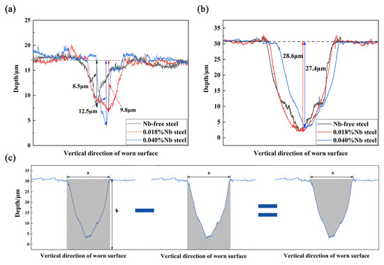 Three-dimensional morphology of the worn surface is shown in Figure 4. At 50 °C, the width of the worn surface decreases significantly, and depth gradually increases with the addition of Nb. But at 125 °C, the change of the width and depth of the worn surface is not obvious. Further observation of the interior of the worn surface shows that the sharp peaks in the figure represented wear debris. At 50 °C, 0.018%Nb steel had the least wear debris. The worn surface of 0.018% Nb steel was flatter than that of Nb-free steel and 0.040%Nb steel. At 125 °C, there were many abrasive particles on the worn surfaces of the three samples. Further analysis of the depth of the worn surface is shown in Figure 5. The result shows that the maximum depth of the worn surface in 0.040%Nb steel is 12.5 μm, while that in Nb-free steel and 0.018%Nb steel is smaller at 50 °C. At 125 °C, the maximum depth of worn surface in Nb-free steel and 0.018%Nb steel is 28.6 μm, and the maximum depth of worn surface in 0.040%Nb steel is 27.4 μm; there is no obvious difference in the three samples. If the shape of the worn surface is uniform in length direction, the length of the worn surface is 3 mm (the stroke in the experiment). The wear volume V is calculated according to Figure 5c and Equation (1):