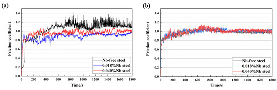 The friction coefficient mainly depends on the contact state between the friction surfaces [40]. The result of the experimental friction coefficient is shown in Figure 7. The average friction coefficient and error of the three samples were shown in Table 2. At the initial stage of wear, the friction coefficient of the three samples fluctuated greatly. With continuous wear time, the friction coefficient of the three samples gradually tended to become stable. When the experimental temperature was 50 °C, the friction coefficient of the three samples needed a long time to reach a stable state, and the fluctuation range of the friction coefficient of Nb-free steel was the largest, as shown in Figure 7a. The friction coefficient of 0.018%Nb steel was the lowest and its average value was 0.88. The friction coefficient of Nb-free steel was the largest, which was 1.05. The friction coefficient of 0.040%Nb steel was 0.96, which was lower than that of Nb-free steel, but higher than that of 0.018%Nb steel. However, at 125 °C, the friction coefficient of the three samples all reached a stable state in a short time, and the fluctuation range was small, as shown in Figure 7b. The friction coefficient of the three samples was essentially the same, which was about 1.00. The results show that the addition of Nb can decrease the friction coefficient of bearing steel at 50 °C. But excess Nb can weaken this effect. This is related to the increase in the number of abrasive particles on the worn surface.