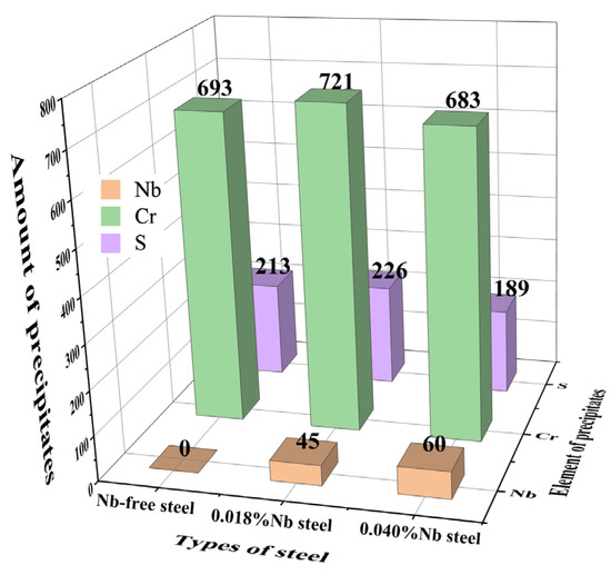 The number of precipitates with a diameter of >1 μm in the 5 mm × 5 mm field of view in the three samples was automatically scanned and counted. The results are shown in Figure 8. It can be seen that there are a lot of carbide precipitates of Cr in the three samples due to the high carbon chromium bearing steel, and the difference in count is small. However, due to the difference in Nb content in the three samples, the number of Nb precipitates is different. There is no Nb added in Nb free steel, so the number of precipitates is 0, the 0.018%Nb steel is 45, and the 0.040%Nb steel is 60. From the analysis of the number of Nb precipitates, the amount of Nb precipitates increases slightly after adding 0.040%Nb.