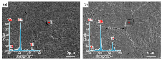 Carbides of 0.018%Nb steel and 0.040%Nb steel were analyzed by EDS, and the results are shown in Figure 9. Ti is a common harmful residual element in bearing steel, which is usually precipitated together with Nb. The higher the Ti content is, the sharper the edges and corners of the precipitates are. There were some Nb-Ti carbide precipitates in 0.018%Nb steel, which were block with 3~4 μm size. Some Nb-Ti carbide precipitates were observed in 0.040%Nb steel, which were blocked with 4~6 μm size. The hard precipitated phase NbC in the matrix is easier to wear as abrasive particles in the friction process. When the main wear mechanism changes from adhesive wear to abrasive wear, the width of the wear surface becomes narrower and the depth becomes deeper.