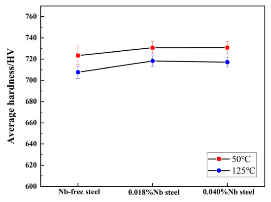 A related study has shown that in the dry friction test at room temperature, Nb mainly affects the friction performance by changing the hardness of the material [23]. The surface hardness of the specimen not rubbed after the friction test was measured, and the results are shown in Figure 10. After the experiment, the hardness of two types of Nb-microalloyed steels was higher than that of Nb-free steel at two temperatures. When the experimental temperature increases, the surface hardness of the specimen not rubbed after the friction test decreases, which proves that one of the reasons for the increase of wear volume is the softening of 100Cr6 steel substrate during the high temperature friction process. The hardness of Nb-free steel was the lowest, and less martensite content was the reason for low hardness. Hardness of 0.018%Nb steel was higher, because its martensite content was higher, too. Hardness of 0.018%Nb steel and 0.040%Nb steel were almost the same. The results show that Nb can still affect the friction properties by changing the hardness at high temperature.