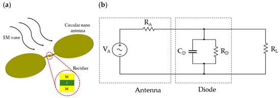 An optical rectenna consists of a receiving nano-antenna and a rectifying diode, as illustrated in Figure 1a. A metal-insulator-metal (MIM) diode has been considered as a prime contender for the rectenna system, and it is the main focus of review in this paper. The MIM diode can operate at terahertz (1 THz = 1012 Hz) frequencies due to the tunneling current mechanism having the electron transit time in femtoseconds (10−15 s). The rectification involves converting the oscillating charges (the alternating current (AC) electromagnetic signal), provided by the antenna arms flowing through the insulating thin film of a MIM rectifier, into a direct current (DC) signal. A simple equivalent circuit of a rectenna is shown in Figure 1b. It consists of an alternating voltage source (VA) with associated antenna resistance (RA) in series with the diode part comprising of the dynamic resistance (RD) and diode capacitance (CD) in parallel with the load resistance RL.