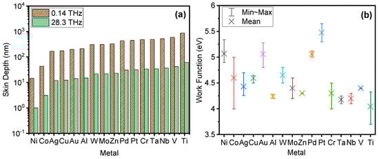(a) Skin depth and (b) work function [11,12,13,14,15,16,17,18,19,20] for typical metals used in a rectenna.