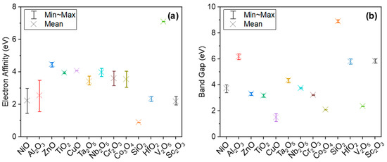 (a) Electron affinity and (b) band gap of typical oxides for MIM diodes. Full details are provided in Table 1.