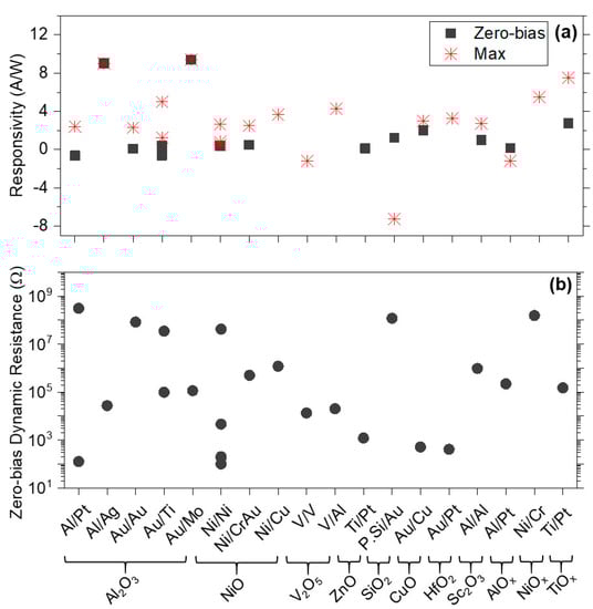 There are a few studies of non-stoichiometric AlOx [29,77], TiOx [78,79] and NiOx [80] based MIMs, where the fabrication parameters are varied to control oxide thickness and hence optimize device responsivity and resistance. A very high asymmetry of 2500 and low zero-bias resistivity of 600 Ω have been achieved with Al/AlOx/Gr (graphene) electrodes [29]. The dipole antenna-coupled Al/AlOx/Pt has been demonstrated with associated IR detectivity of 9.65 × 106 cmHz1/2W−1 [77].