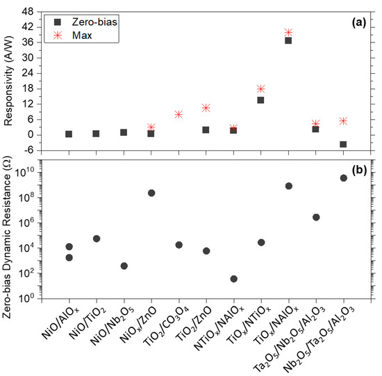 (a) Responsivity and (b) zero-bias dynamic resistance for MInM diodes. For full details, please see Table 3.