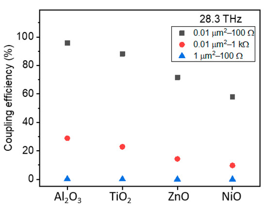 Consider that the antenna has a resistance of 100 Ω for capturing IR radiation and the case of a full impedance match between the diode and the antenna. Furthermore, let us assume the same diode resistance as the antenna. Figure 7 depicts the power coupling efficiency at 28.3 THz of a rectenna that constitutes an MIM diode incorporating four of the most commonly used oxides.