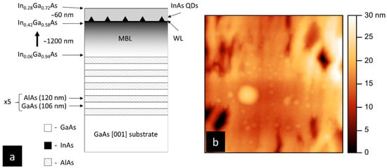 - Semenova, E.S.; Zhukov, A.E.; Mikhrin, S.S.; Egorov, A.Y.; Odnoblyudov, V.A.; Vasil’ev, A.P.; Nikitina, E.V.; Kovsh, A.R.; Kryzhanovskaya, N.V.; Gladyshev, A.G.; et al. Metamorphic growth for application in long-wavelength (1.3–1.55 μm) lasers and MODFET-type structures on GaAs substrates. Nanotechnology 2004, 15, S283–S287. [Google Scholar] [CrossRef]