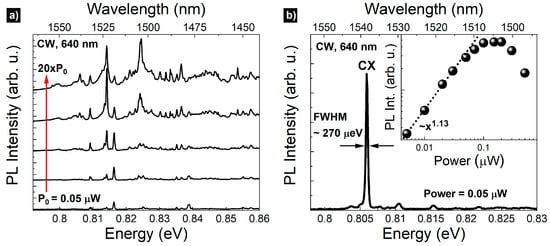 - Dusanowski, Ł.; Syperek, M.; Mrowiński, P.; Rudno-Rudziński, W.; Misiewicz, J.; Somers, A.; Höfling, S.; Kamp, M.; Reithmaier, J.P.; Sęk, G. Single photon emission at 1.55 μm from charged and neutral exciton confined in a single quantum dash. Appl. Phys. Lett. 2014, 105, 021909. [Google Scholar] [CrossRef] [Green Version]
