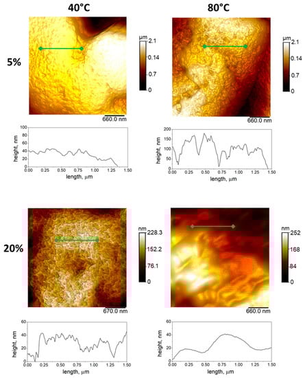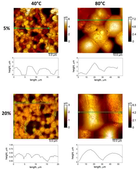 Figure 2 shows the height profile images for the different PVDF films produced in this study, and the relative profiles. It is interesting to note that the AFM analysis (i.e., interdomain measurements) confirms the spherulitic morphology highlighted by the SEM images, with the size of the spherulites increasing with the cast temperature and decreasing with solution concentration.