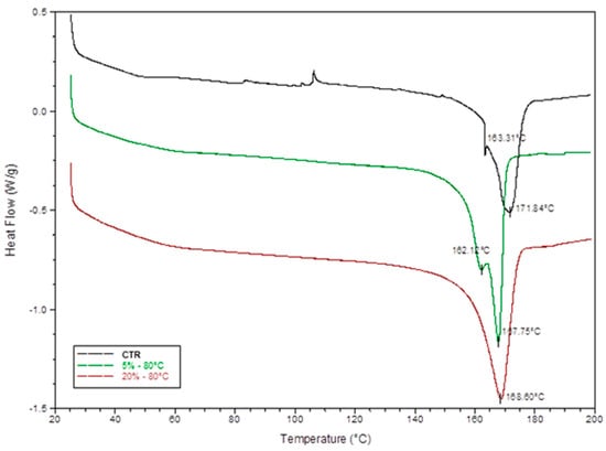 22]. In this study, results highlighted that the temperature-treated films (80 °C) are characterized by higher crystallinity as confirmed by higher heat of fusion—ranging from 58.4 to 60.6 J g