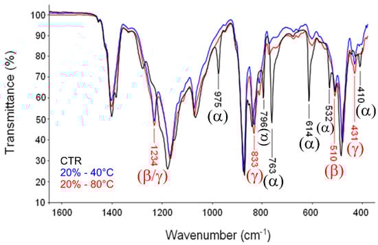 25], there are several signatures that identify the different crystalline modifications. These are located at 410, 489, 532, 614, 763, 795, 854, 975, 1149, 1209, 1383 and 1423 cm