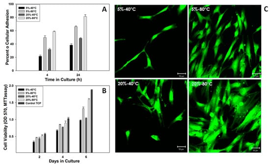 Figure 6B, no significant differences were detected among cells, regarding cell body elongation and fibroblastic morphology. In this context, the effect of polymer concentration and casting temperature on cell viability was quantitatively evaluated via MTT assay after 2, 4, and 6 days of cell culture, by measuring the optical absorbance at 570 nm (