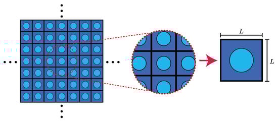 To understand periodic structure theory (PST), it is necessary to establish the equations used to describe the phenomenon of mechanical wave propagation in periodic materials. Let us consider a continuum two-dimensional (2D) structure, as shown in Figure 1. In this example, a square cell with edge length L has been chosen to tile an infinite 2D space. The structure does not necessarily need to be a square, and it could possess a complex 2D [37] or 3D [38] geometry.