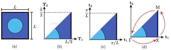 The periodic square geometry extracted from Figure 1. is studied in Figure 2a. Three reflexive symmetries can be depicted: horizontal, vertical, and 45° symmetries. Considering these symmetries and locating the reference system at the center of the structure, this structure can be represented using a reduced zone, as illustrated in Figure 2b. An important concept in PST corresponds to the definition of a reciprocal space, which is described by the vectors and considering the structure length as (for further information see ref. [39]). Figure 2c shows the same information as Figure 2b, but in the reciprocal space.