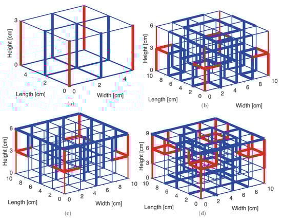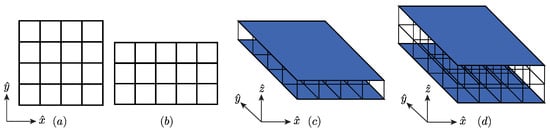 There are numerous methods of geometrically arranging the core of the sandwich panel. In this research, a rectangular lattice structure will be employed as illustrated in Figure 3. The topology of the core is described by the number of cells in the directions , and using the variables , , , respectively. Furthermore, the length in each direction is denoted with , , and . A scheme of this configuration is presented in Figure 3. Here, Figure 3a,b show the in-plane unit cells (considering ) using in the first case and and in the second. The sandwich panel unit cells with are illustrated in Figure 3c,d, in particular for . Note that Figure 3c,d use and , respectively. Therefore, these three parameters are used to control the number of cells, specifically to allow a wider range of possible geometries. The cross-section of the struts will be supposed to be circular with a diameter D.