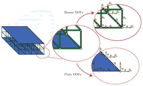 Sandwich plate surfaces showing the DOFs of the nodes on the beams and plate elements.