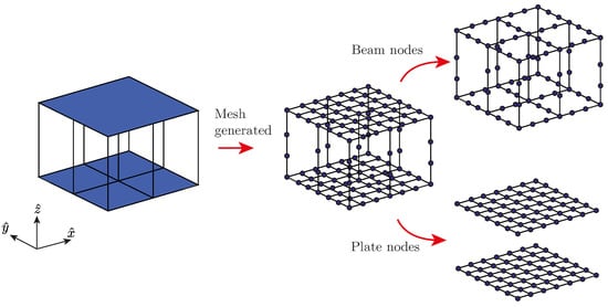 The PST is implemented to infinitely replicate the sandwich panel unit cells shown in Figure 3 in the - plane. Taking into consideration Figure 6, the nodes in each layer are split to implement the Floquet–Bloch periodic condition. The nodes are split into sets , , , , and , which are the left, right, bottom, top edges, and interior nodes, respectively. Depending on the layer, these nodes may be in the beam elements or in both the plate and beam elements, as shown in Figure 6.