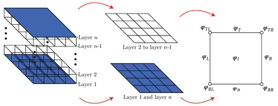 where the superscript represents the j-th layer and is a vector of the rotational or displacement degrees of freedom. The subscript L represents all the nodes in the left edge, R is used for the right edge nodes, B for the bottom edge nodes, and T for the top edge nodes. The degrees of freedom over the corners are denoted by the subscripts , , , and according to Figure 6. All of the internal degrees of freedom in the j layer are arranged in the vector .