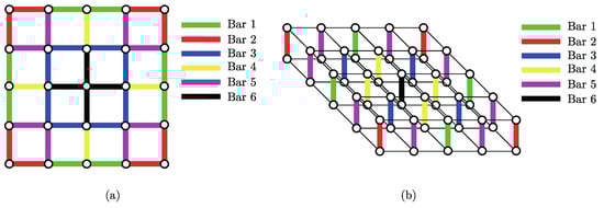 Finally, using the symmetries shown in Figure 2, it is possible to diminish the number of optimization variables related to the bars by forcing the unit cell to accomplish the symmetries, as illustrated in Figure 7. Note that even though the colors are the same in Figure 7, the bars in both subfigures are independent.