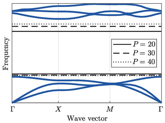Figure 8 illustrates a band diagram with the presence of a bandgap. Equations (15) and (16) are evaluated for different values of P, considering and . It is observed that as P increases, Equation (16) converges to the true minimum and Equation (15) to the true maximum despite intersections (repeated values) in the band diagram.