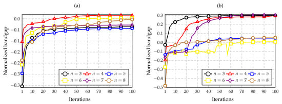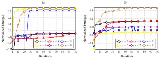 The plots presented in Figure 9a show that the best bands are , 6, and 8 for this optimization goal, in which the convergence was obtained in less than 50 iterations. The three curves achieve similar normalized bandgap values of approximately 0.33 and 0.36. In Figure 9b, the best results were obtained for , followed by those for and . The value achieved for was the maximum among all the other convergence plots, with a normalized bandgap of 0.46. Considering Figure 10a, only one positive normalized bandgap value was obtained for with a value of 0.016. By analyzing Figure 10b, the three bands of , 4, and 7 show similar results with an optimum value near 0.3. Finally, considering the plot shown in Figure 11, the best maximum values are achieved by using and considering and 3.