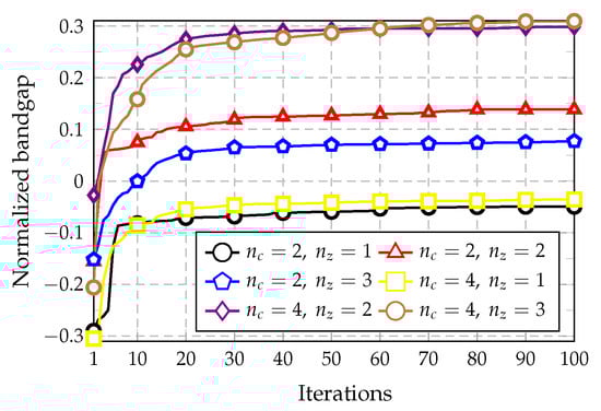 Figure 9 presents the convergence plots for the combinations and or 2, whereas Figure 10 shows the iteration results for the combinations and or 2. Lastly, Figure 11 compares the convergence plots for and 4 considering to 3, using the same band for optimization (). The last case is performed to study how the complexity of the cell influences the optimization. It should be noted that negative values of the normalized bandgap indicate that no bandgap exists because the bands are overlapping.